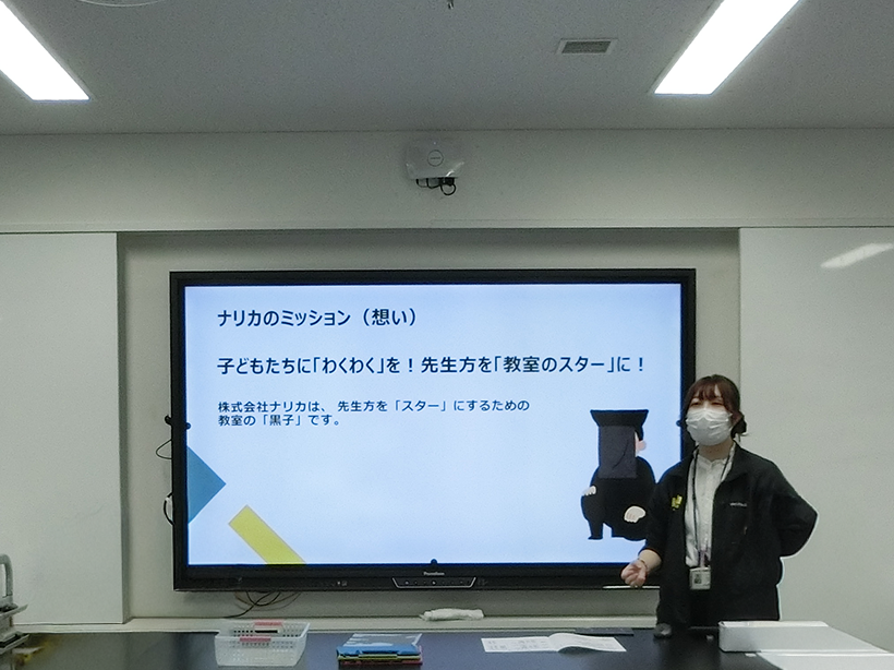 会社紹介、社内見学、製品紹介では、ナリカの会社や製品について実際に見て触って学びました。