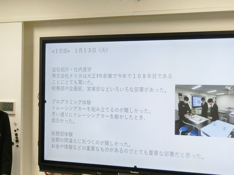 会社紹介、社内見学、プログラミング体験では、ナリカの会社や製品について実際に見て触って学びました。